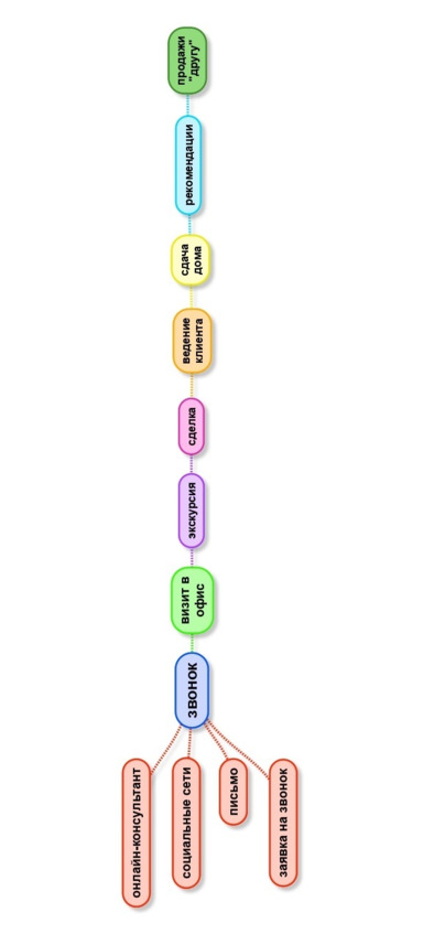 На рисунке 2 изображен наиболее длинный путь клиента. Конечно, он может быть короче. Некоторые точки контакта, например визит в офис или экскурсия, могут отсутствовать в работе с тем или иным клиентом. Кстати, в большинстве случаев сокращение пути происходит благодаря именно менеджеру отдела продаж, частично специалисту кол-центра.