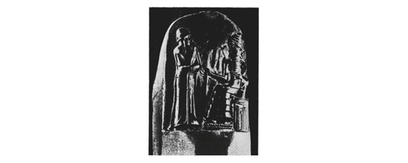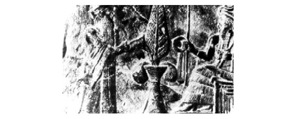 El rey (de pie) trae al Dios de la Luna (sentado) un sacrificio con vino, en el recipiente sagrado hay una rama de palmera y dos racimos de dátiles. Tanto el vino como la palma datilera son objetos sagrados. Un dibujo similar tenía una estela con las leyes del rey Hammurabi, que estaba frente a la Deidad Shamash (Dios de la Luna) del siglo XVIII. Se ve claramente que Dios tiene una forma completamente humana, es muy probable que sea un sacerdote, un hipnotizador, un psíquico.