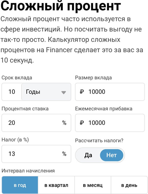 Посчитать сложные проценты быстро можно введя в поисковой строке любого поисковика фразу «Калькулятор сложных процентов».