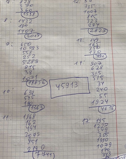 С 7 по 17е – даты месяца, напротив каждой даты столбиком указаны суммы трат, обведенная кругом сумма – итого за день. 45913 рублей – итого траты за 10 дней месяца.