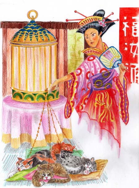 – Кажуть, у той день було свято. Красуня-киця, яку всі обожнювали, сиділа на золотому повідку біля імператора. Якоїсь миті в імператриці відчепилася з вуха і впала на підлогу дорогоцінна сережка, яка вмить закотилася далеко в куток. Прудка миша – не забарилася і тут же спробувала її вкрасти. Не розгубився і син імператора – розірвав золотий повідець, відпустив Кицю, яка вмить упіймала мишку і повернула сережку власниці.