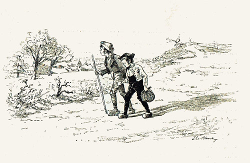 Ранним утром мы отправились в путь и отправились в Эте, примерно в часе ходьбы от нашего дома. Это был ярмарочный день. Мой брат прикрепил к моей шапке пучок дубовых листьев и сдал меня внаем в качестве пастуха. За год я заработал двадцать четыре франка и пару деревянных башмаков.
