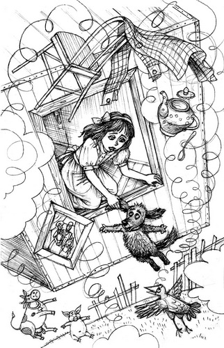 І тут трапилось щось дивне. Будинок закружляв неначе дзига, а згодом став повільно підніматися вгору. Смерч підхопив його і поніс все далі і далі від місця, де той завжди стояв.