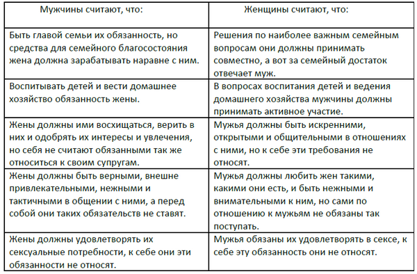 Чтоб не пил, не курил,И цветы всегда дарил.В дом зарплату отдавал,Тёщу мамой называл.Был к футболу равнодушен,А в компании не скушен.И к тому же чтобы онИ красив был, и умён.В целом первичный анализ выше перечисленных социальных установок позволяет сделать вывод, что представление мужей о своих обязанностях и обязанностях жены несколько иные, чем семейные стереотипы замужних женщин по отношению к себе и своим супругам. Для наглядности рассмотрим эти различия в табличном виде (см. таб. 1).