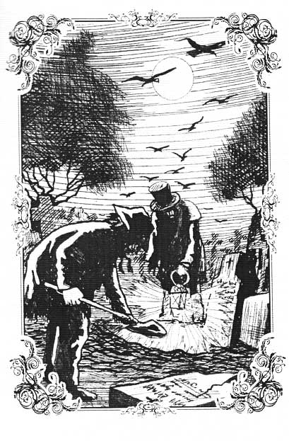 Дорога заняла ни много ни мало – примерно часа полтора, но зато и время теперь было еще более подходящим. На улицах Лондона не было ни единой души, весь город был сокрыт под покровом холодной ночи. Подойдя к ограде кладбища, которая заключалась лишь в невысоком заборе, преодолеть который не составляло никакого труда, мы остановились, чтобы прислушаться к затаившейся тишине. Убедившись, что тишину не нарушало ничего, кроме ветра, периодически игравшего среди опадавшей листвы деревьев, мы решили, наконец, преодолеть препятствие, перебравшись через ограду. Первым полез я, взявшись руками за две торчащие пики каменного забора, я подтянулся и с легкостью перебрался через ограду, оставив своего помощника снаружи.