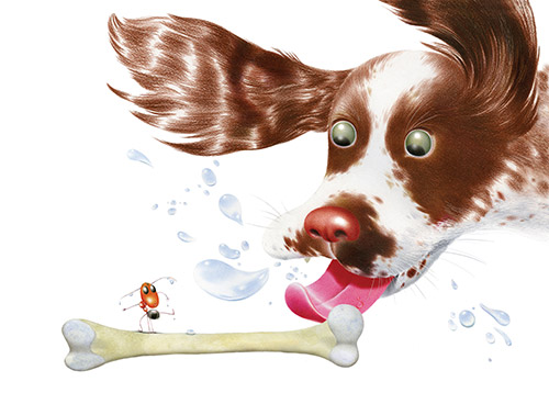 Когда муравей Геша был еще маленьким, он решил немного прогуляться и вышел с утра из муравейника. Сначала он переполз через лепесток, перебрался по травинке и прошел вдоль лесной иголки, затем поднялся на листик ландыша и огляделся. Неподалеку Геша увидел странный, незнакомый белый предмет и решил спуститься, чтобы его исследовать. Подойдя, к огромного размера куриной косточке, он взобрался на нее и почувствовал приятный аромат остатков вареного мяса. Геша вцепился клещиками и оторвал себе удобный ломтик. Сладкий вкус курочки передал радость всему телу. Но не успел еще Геша съесть первый кусочек, как всей своей спинкой ощутил дыхание горячего ветра. Муравьишка повернул голову – и, о страх и ужас, перед ним нависала огромная морда маленького щенка.