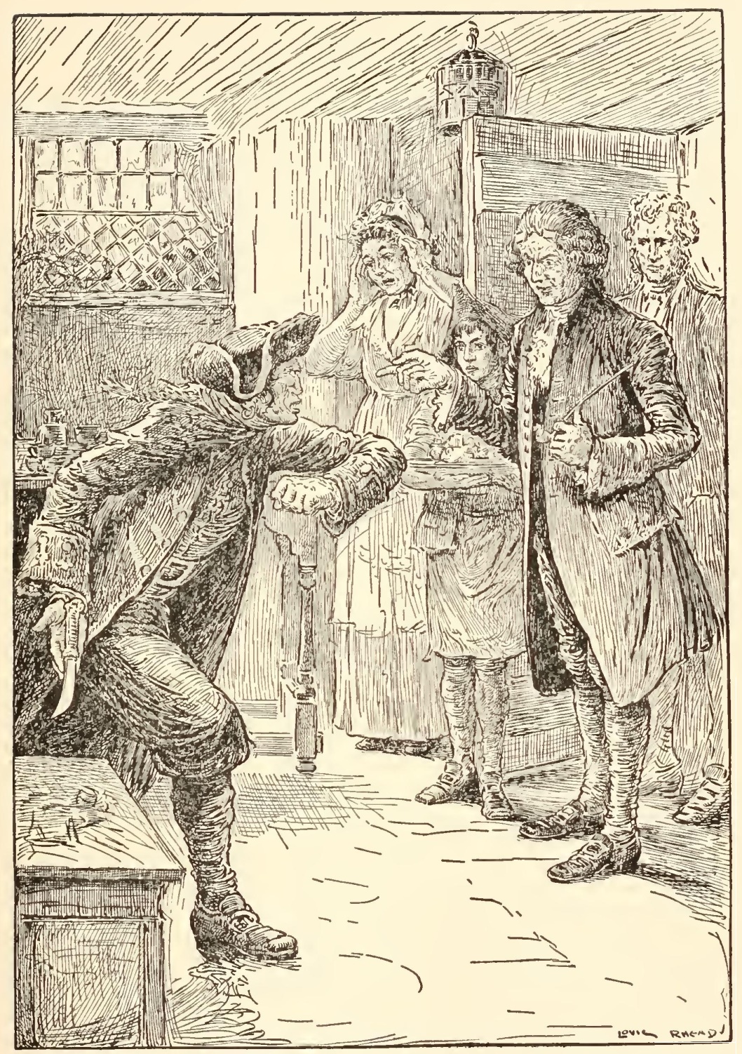 Затем вдруг донесся страшный шум вперемежку с целым потоком ругательств; стол и стул полетели на пол, раздался звон стали и затем крик боли. В следующую секунду я увидел Черного Пса обратившимся в бегство. Капитан пустился за ним вдогонку, и у обоих были обнажены кортики, а у первого текла кровь из левого плеча.