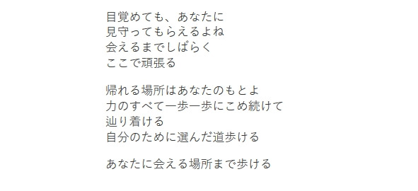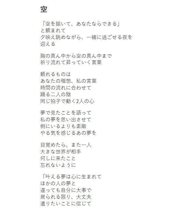 «Нарисуй небо; ты – сможешь», —Просишь ты.Любуясь закатом, мы встречаем ночь,Которую сможем провести вместе.Из середины груди к середине небаПотоком молитв поднимаются слова.То, на что можно положиться, —Это твои идеалы и мои слова.В ритме времениТанцуют две тени.В одном и том же ритме бьются два сердца.Расскажи, что ты видел во сне —Помоги мне вспомнить мою мечту.Такую мечту, исполнять которую я хочу больше,Чем быть с тобой.Когда я проснусь, я вновь буду один,Наедине с миром,Вот бы мне не забыть,Для чего я пришёл.«Мечта, которая может исполниться,Рождается в сердце. И даже если она отличается от мечт других людей,До тех пор, пока она дорога тебе, всё в порядке.Просто верь тому, что ты хочешь делать».И после того, как я проснусь,Конец ознакомительного фрагмента.