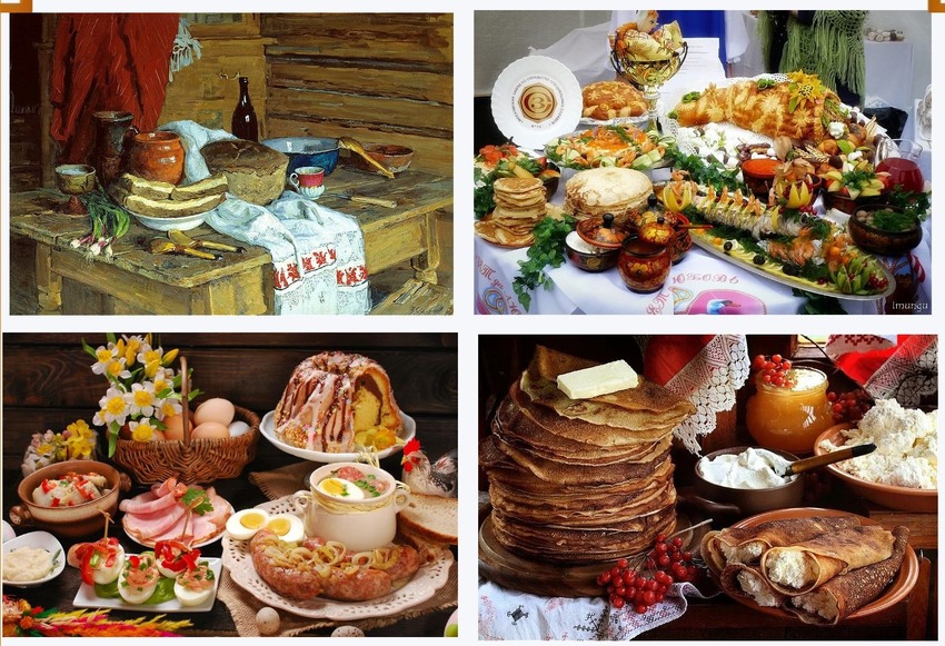 1. Посмотрите на картины, подумайте к каким праздникам можно отнести эти блюда? (Великий пост, Масленица, Пасха, Троица). Почему?
