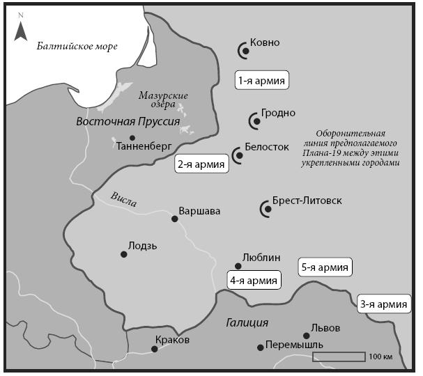 Самым значительным военным событием первой недели стала оккупация и последующее разграбление немцами приграничного города Калиш 20-21 июля (2-3 августа), о чем будет рассказано далее в этой главе, а также оккупация города Ченстохов (с его знаменитой католической святыней), однако эти нападения бледнели в сравнении с войной, которая разгоралась на Западном фронте. Пока Франция и Бельгия отходили от шока первых баталий, русские под руководством своего главнокомандующего-франкофила, великого князя Николая Николаевича11, спешили с мобилизацией. 28 июля (10 августа) генерал Н. Н. Янушкевич (начальник штаба Верховного главнокомандующего, или Ставки) телеграфировал генералу Я. Г. Жилинскому (командующему Северо-Восточным фронтом), указав, что и 1-я, и 2-я армии должны быть в состоянии боеготовности к 12-му дню мобилизации: следовало ослабить давление на западных союзников. Далее он требовал от Жилинского обеспечить надежные коммуникации между двумя армиями, чтобы наступление, которое велось с обоих флангов, завершилось охватом немецких войск в Восточной Пруссии[26][27]. Жилинский отвечал, что, хотя некоторые части будут готовы к действиям, другие по-прежнему остаются на марше и добираются до намеченных позиций. Он предполагал, что полномасштабное наступление может состояться только на 20-й день мобилизации[28]. В этом случае график вторжения отражал как желание быстрее атаковать, так и необходимость дальнейшей мобилизации до того, как можно будет предпринимать крупные сражения. Армия Ренненкампфа перешла границу 29 июля (11 августа) [Showalter 2004:137], однако первый крупный бой произошел под Шталлупененом (Нестеровом) 4(17) августа. Это было кровопролитное, но неопределенное по результату столкновение, которое вскорости вылилось в Гумбинненское сражение 7 (20) августа примерно в 25 километрах к западу. Исход его был более конкретен – явная победа русского оружия. В тот же день, как и обещал Жилинский, 2-я армия генерала А. В. Самсонова вторглась в Восточную Пруссию с юга.