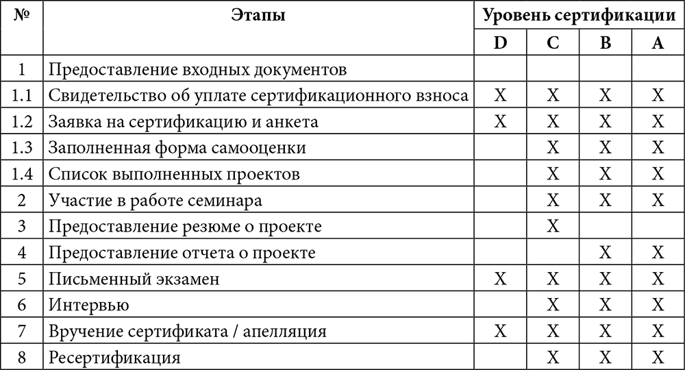 Общая схема этапов сертификационного процесса для разных уровней сертификации представлена в табл. 2.2.