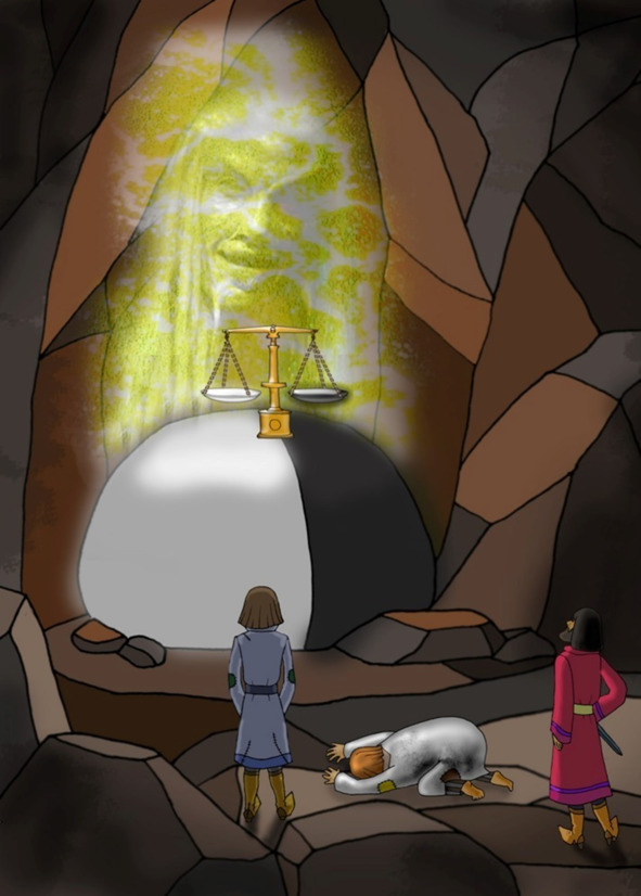 When the travelers entered the cave, they saw a big flat rock. It was lying in the middle of the cave. It was half black and half white. On this unusual rock there were huge scales. One scale was light, bright and shining. It hurt to look at it – so blinding it was. The second scale was dark, and it emanated terrible cold. It was so powerful that fear reached your bones.