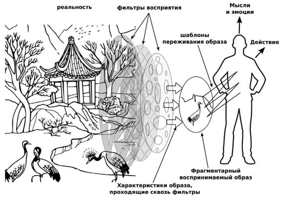 Все эти три фильтра составляют основу ментальной конструкции эго. Нейрофизиологический аппарат, социальные и личностные предписания являются той самой подсознательным фундаментом, отлаженным с годами механизмом, который формирует уникальную для каждого человека личную реальность. Так и получается, что своим выборочным восприятием именно сам человек избирает, что для него реально, а что нет, а так же выбирает способы реагирования из тех записанных установок и предписаний, которые удалось накопить за жизнь. Так человек воспринимает только малую долю настоящей реальности, которой удалось просочиться через все эти фильтры. Следовательно, каждый из нас живет в своей собственной изменённой реальности, которую он способен воспринять, а именно – во фрагментарной иллюзии, созданной нашим эго.