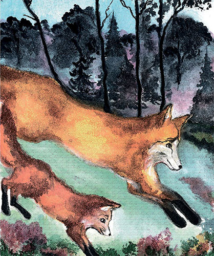 Пролетают деньки, превращаясь в недели.Недели неспешно сливаются в жизнь.Становился лисенок выше, сильнееИ с папой все дальше он уходил.Папа его – мудрый учитель —Уводил сына вдаль по лисьей тропе.Гордый вожак, своего сына хранитель,Лисенка готовил к счастливой судьбе.Рассказывал сказки, оды и песни,Что рождались в сердцах храбрых зверей.О том, как опасной минутою вместеСтановились в защиту своих малышей.О том, как в часы неудачной охотыПоддержат жизнь родные леса.Подарят плоды первозданной природы:Коренья и ягоды – вот чудеса!О том, как порою ловкость и смелостьПомогают уйти от верной беды.Там, где трусливый посчитает за дерзость,Петляя, запутать свои же следы…Хитрец обязательно сможет уйти.Бывали особенно тихие ночи,И лесные напевы отзывались в душе.Малышу эти песенки нравились очень,Нередко он пел их в родимой норе.«Сын мой, смотри: наши земли родныеУкроют тебя от горя и зла.Ты их почитай: эти кроны густые:Деревья, цветы – родные края.