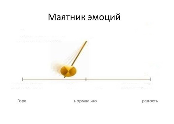 Есть еще одна особенность эмоций, которую мне хотелось бы с вами обсудить. Еще в прошлом веке в одной из книжек по психологии мне попалось определение «маятник эмоций». Согласно этому определению, наше базовое настроение является точкой крепления этого маятника. Сам же маятник постоянно раскачивается от счастья до горя с большей или меньшей амплитудой. На вопрос: «Какое у тебя сейчас настроение?» большинство людей отвечают: «Нормальное». Я не понимаю такой ответ. Что значит нормальное? Нормальное для вас и нормальное для ваших коллег это разные понятия. При этом маятник эмоций актуален и для вас, и для меня. Наше настроение действительно постоянно меняется, но в определенных пределах. И это изменение мы определяем как горе или радость. Это не так. Люди, живущие в депрессии, могут испытывать прилив хорошего настроения, но они не испытывают то безмятежное счастье, которое доступно людям, живущим в радости. Точно так же вся полнота горя доступна только людям, живущим в депрессии. За долгие годы работы с эмоциями людей, я пришел к выводу, что абсолютное большинство людей не испытывают истинной радости многие и многие годы. За чувство радости принимается колебание маятника эмоций, совершающегося относительно точки крепления маятника. Большинство психологических приемов направлено на увеличение амплитуды колебания, а не на смещение точки крепления. Поэтому и результаты работы психологов, психотерапевтов, школ медитации и прочих недолговечны.