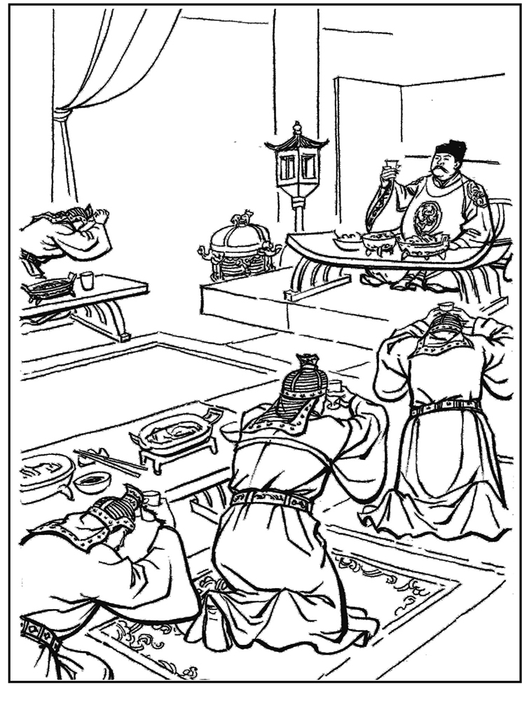 В 961 году нашей эры однажды ночью Сун Тай-цзу пригласил к себе предводителей дворцовой гвардии Ши Шоусиня и Ван Шэнци под предлогом выпить в компании. Все знали, что император любитель выпить, поэтому они с удовольствием пошли осушить несколько чашечек. Но кто бы мог подумать, что во время радостного застолья Сун Тай-цзу, тяжело вздохнув с хмурым лицом, скажет: «Вы все – герои, если бы не вы, где бы я был на данный момент? Но это такая изнуряющая работа, уж лучше быть простым правителем области. Уж как давно не сплю ночами я!». Все были ошеломлены, услышав это. Спросили они: «Что вас беспокоит?». Сун Тай-цзу заметил, что они не поняли намека, поэтому прямо сказал: «Очевидно же, кому не хотелось бы посидеть на императорском престоле?». У всех сердце в пятки ушло после этих слов. Узнав, что у императора возникли подозрения, они наперебой заговорили: «Вы слишком много переживаете. Ваша власть уже предрешена, кто осмелится что-то менять?». Сун Тай-цзу с усмешкой сказал: «Не говорите так, вы не двуличны, я верю. Но если ваши подчиненные захотят обогатиться и надели на вас желтый халат, как вы поступили со мной, разве вы сможете воспротивиться?». Все были напуганы до слез. Они один за другим опустились на колени, кланяясь ему и утверждая: «Мы глупы и не знаем, что делать, чтобы Вас успокоить, пожалейте нас, укажите нам правильный путь».