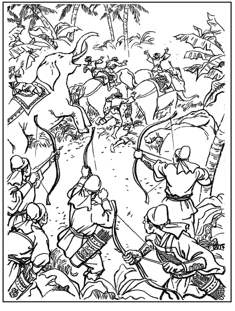 Слоны, получив ранения от стрел, затрубили, и повернули обратно