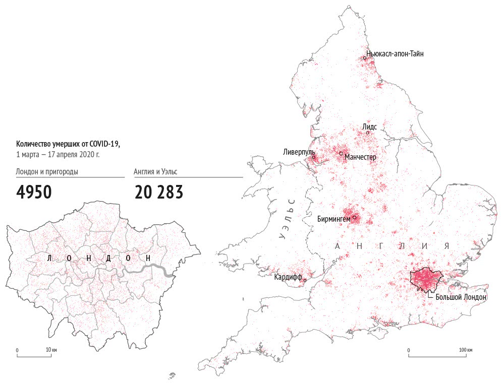За первые шесть недель стремительного распространения вируса в Великобритании умерло 20 000 человек. Каждая точка обозначает одну смерть.