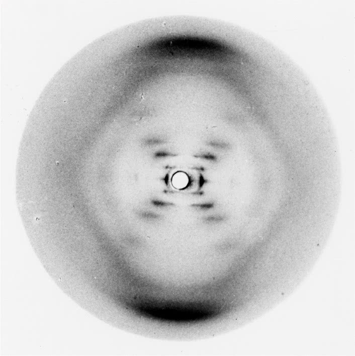 Розалинд Франклин и ее аспирант Рэй Гослинг более 60 часов бомбардировали нить ДНК рентгеновскими лучами. Сталкиваясь с электронами в атомах молекулы, лучи отражались и создавали этот крестообразный рисунок, на основе которого ученые сделали вывод о том, что структура ДНК имеет вид двойной спирали.