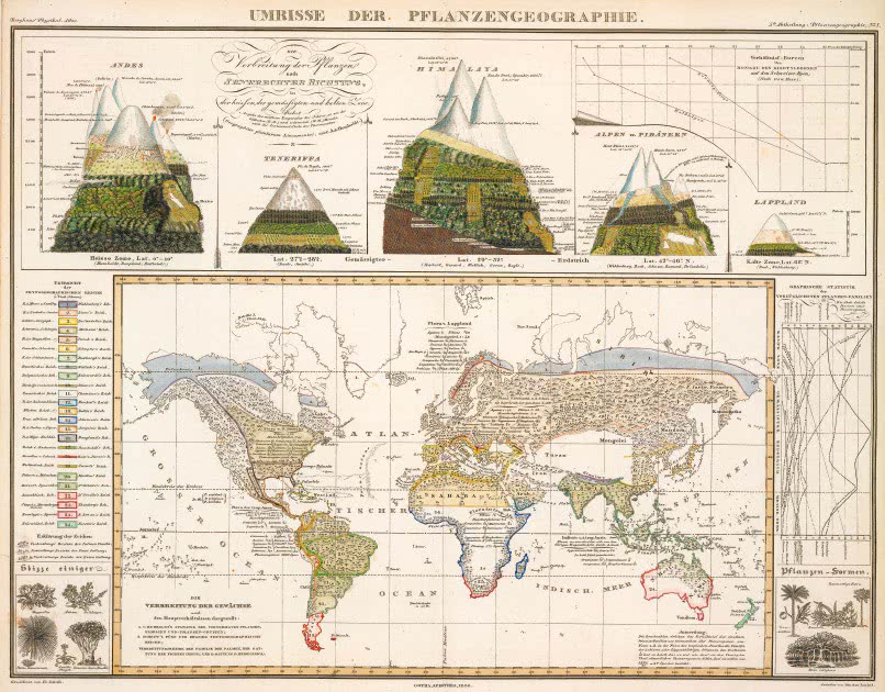 Карта зон растительности и распространения семейств растений (1838); Генрих Бергхаус дополнил ее ботаническими иллюстрациями и диаграммами, чтобы показать, что произрастает на разной высоте над уровнем моря.