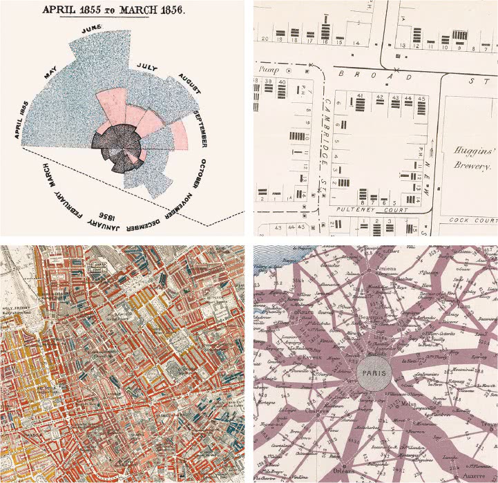 По часовой стрелке, начиная с верхнего левого изображения: «петушиный гребень» Найтингейл; печально знаменитая вспышка холеры на Брод-стрит на карте Джона Сноу; пассажирские перевозки во Франции в 1890 г.; уровни бедности на карте Лондона, составленной и вручную раскрашенной Бутом.
