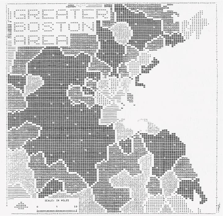 Действуя наподобие печатной машинки, SYMAP использовала сетку из тире, плюсов, цифр и других символов для формирования изображений – в данном случае контурной карты высот Большого Бостона.