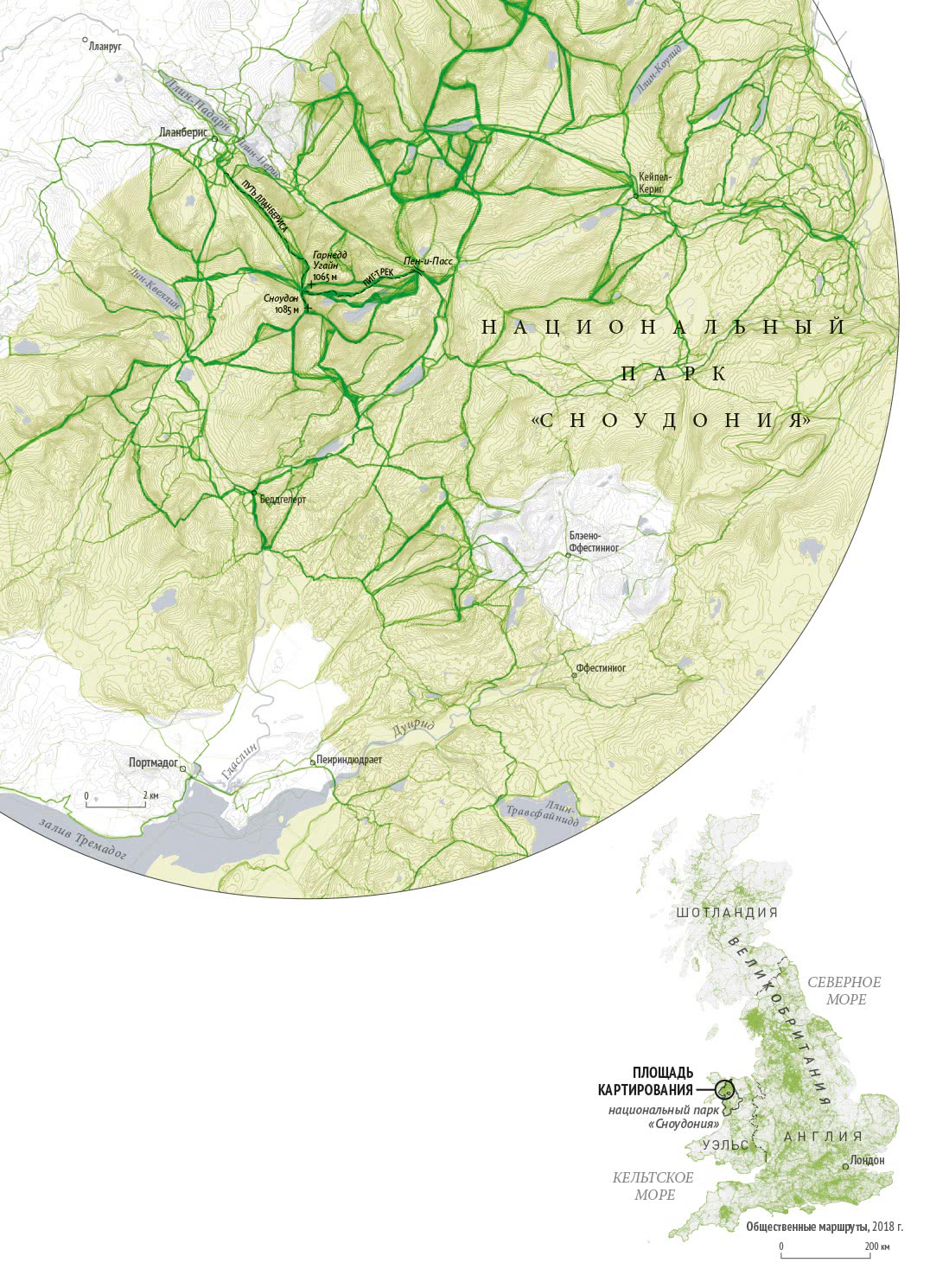 Национальное картографическое агентство Великобритании создало приложение для планирования путешествий. В 2010-е годы пользователи записали почти 11 млн треков. Сверху показаны 400 000 из них. Картограф Чарли Глинн, принимавший участие в разработке приложения, был удивлен тем, как хорошо пешие туристы очертили побережье Британии: «Хотя это всего лишь набор линий, он создает реальную, четкую картину места». Кроме того, приложение позволило выявить самые популярные маршруты в стране. Национальный парк «Сноудония» в Уэльсе удерживал первенство многие годы. Со всех сторон к вершине Сноудон высотой 1085 м стекаются туристы (см. иллюстрацию выше).