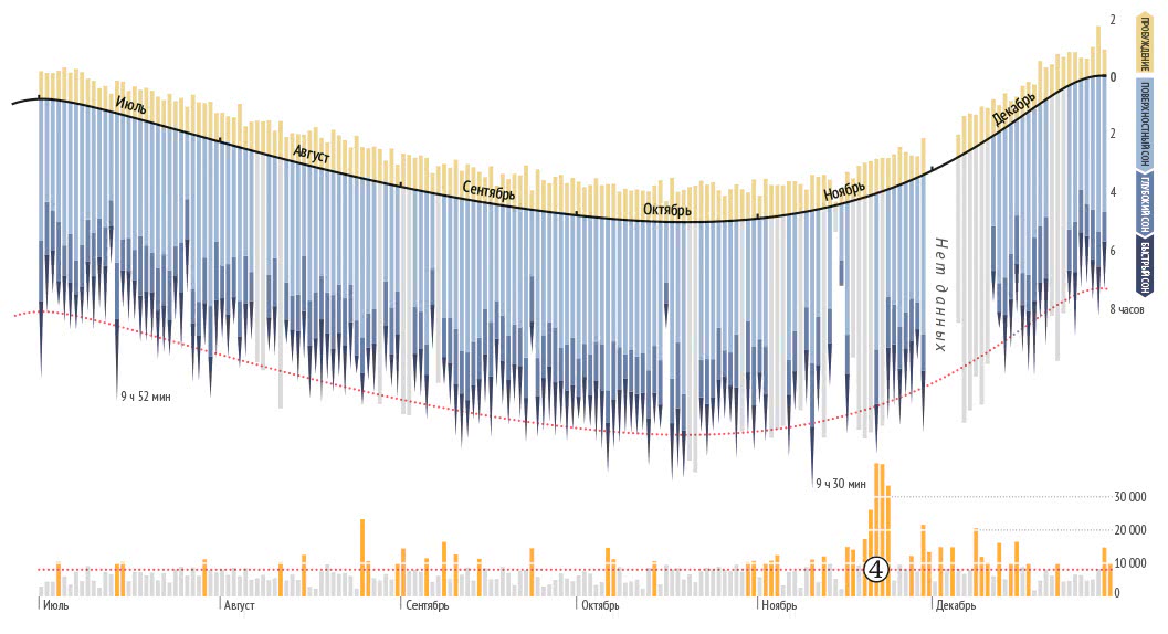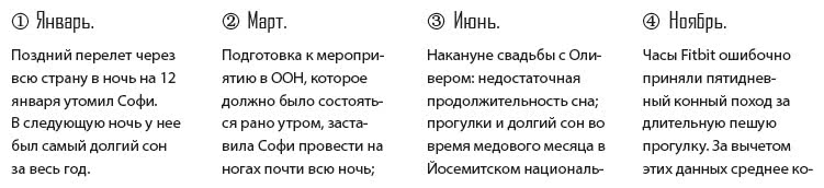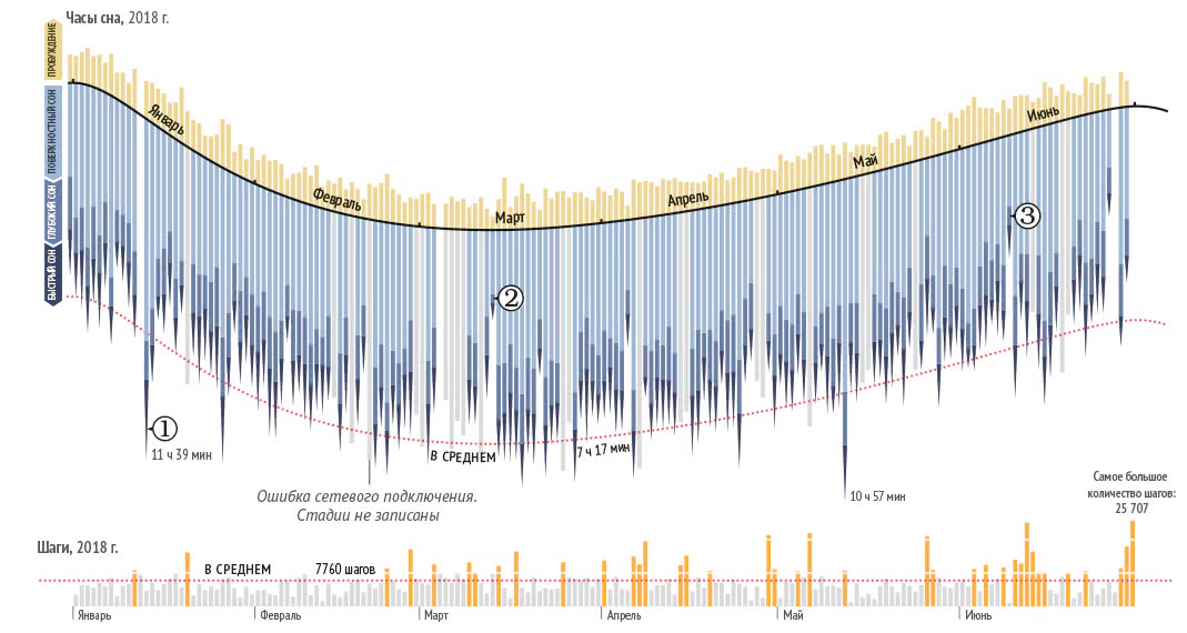 В 2018 году жена Оливера Софи начала носить часы Fitbit, с помощью которых могла отследить уровень своей физической активности, а также продолжительность и качество сна. Этот год у нее выдался насыщенным: частые поездки по работе, замужество, медовый месяц, – так что она нисколько не удивилась, обнаружив, что плохо спала во время перелетов и очень крепко – после долгих пеших прогулок. Настоящие же открытия носили более личный характер: данные показывают, что Софи каждую ночь просыпается на непродолжительное время (эти короткие перерывы во сне отображены на схеме в виде желтых полосок). Чтобы проспать восемь часов, ей нужно провести в кровати девять.