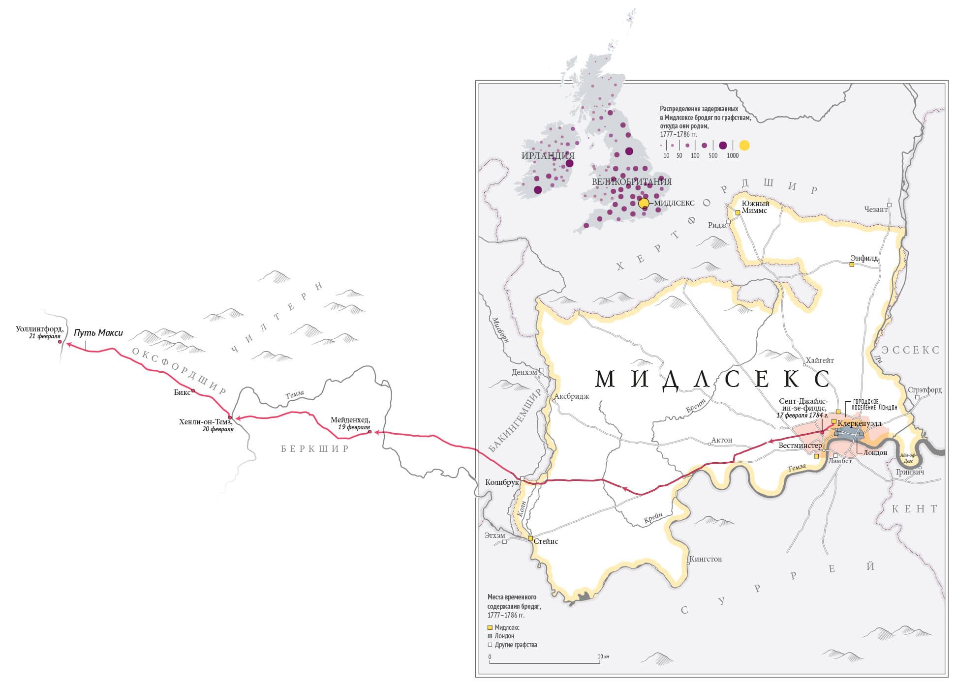 Вместо того чтобы бороться с причинами, вызвавшими проблему, законы о бродяжничестве превращали бездомных в невидимок. Одним из таких людей был Левер Макси, «разбойник и бродяга», арестованный в Сент-Джайлс-ин-зе-филдс в 1784 году и заключенный в исправительный дом Клеркенуэлл вместе с женой и ребенком. Он был «перемещен и перевезен» на повозке в другой город, находившийся на расстоянии в 60 миль. Мы знаем о Макси благодаря проекту Vagrant Lives, в ходе которого были оцифрованы судебные записи о 14 789 бродягах, высланных из Мидлсекса в период с 1777 по 1786 год. Набор данных раскрывает сеть перемещений, охвативших всю страну (см. рисунок ниже), а подробный отчет на обороте судебного приказа о высылке Макси позволяет нам проследить путь отдельного человека.