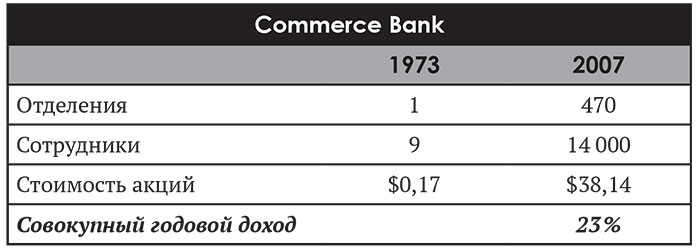 Вот наглядная иллюстрация того, насколько ценной может быть верность несокрушимым принципам. Вернон Хилл основал Commerce Bank в 1973 году. В 2010 году он создал Metro Bank (Великобритания), взяв за основу ту же модель, а в 2016-м заступил на пост председателя Republic Bank. Вернон – самый клиентоориентированный руководитель из всех, кого я знаю. Он не бросает слов на ветер и понимает финансовую выгоду первоклассного сервиса.