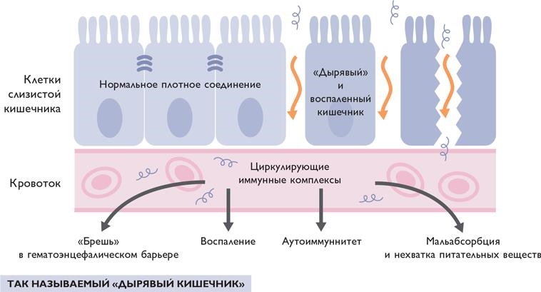 Под проницаемостью кишечника понимают измененное состояние клеток эпителия кишечника. Обычно нутриенты всасываются через клетки эпителия. Однако иногда клетки и плотные соединения между ними становятся «дырявыми» и начинают пропускать вредные вещества в кровоток. Целиакия – типичный пример аутоиммунного заболевания с проницаемостью кишечника. Повышенная проницаемость кишечника (синдром «дырявого кишечника») – один из ключевых факторов в развитии аутоиммунных заболеваний. Но ученые пока не могут определить, что является причиной, а что следствием[196],[197].