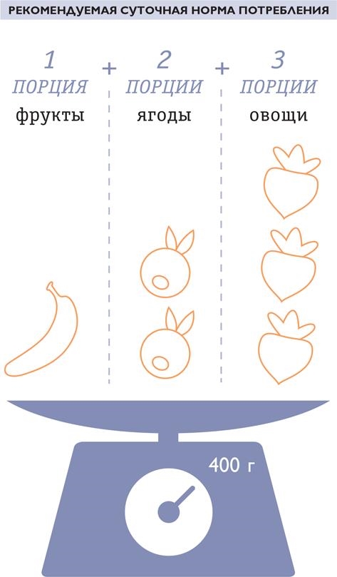 Обычно диетологи рекомендуют съедать 5–9 порций (около 400 г) фруктов, овощей и ягод ежедневно. Однако соблюдают эти рекомендации не более 10 % людей. Исследование, проведенное в Финляндии, показало, что 75 % мужского населения страны съедают всего по две порции фруктов, овощей и ягод в день[382].