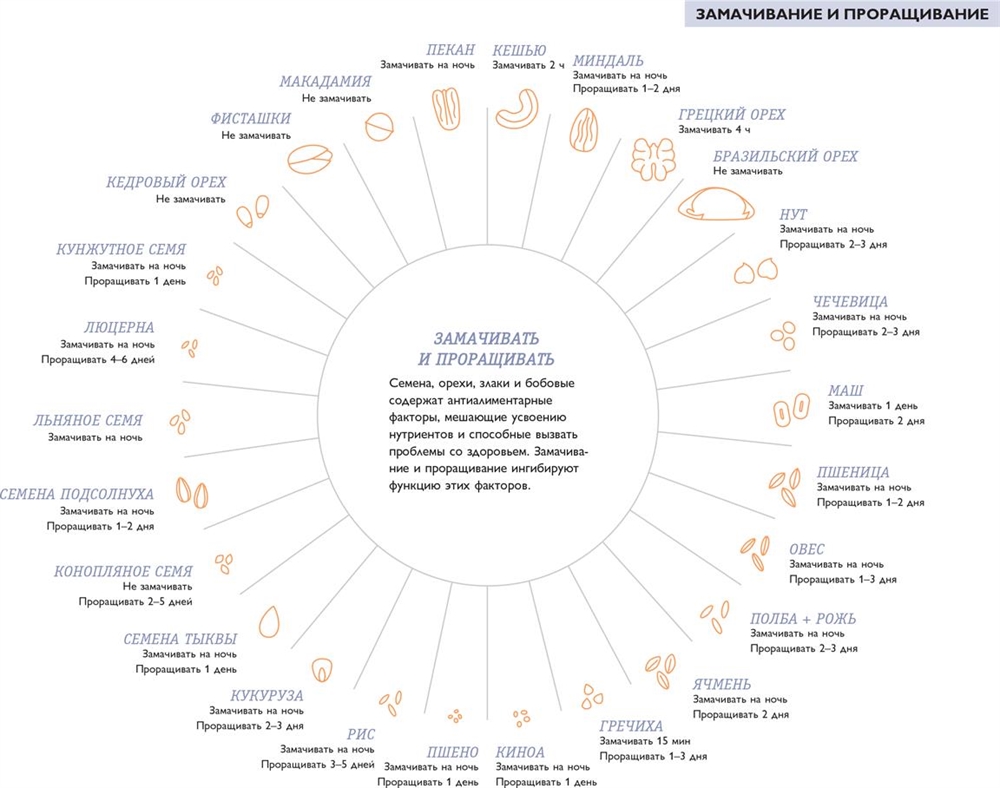 Семена обладают чрезвычайно высокой плотностью нутриентов. Однако растения всегда стараются защитить семена от повреждений при помощи определенных соединений. Поэтому очень важно предварительно обрабатывать семена – замачивать, проращивать – для усвоения нутриентов и устранения вредных веществ (антинутриентов; см. раздел «Антинутриенты»).