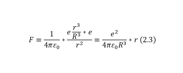 And if we already substitute this value for the Coulomb force, we get (2.3), a rather interesting expression that is directly proportional to the distance by which the electron moves away from the center.