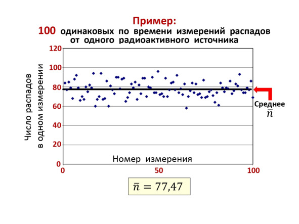 As an experimental analysis of this phenomenon, the following can be shown. 100 measurements were carried out over the same period of time and the number of decays was measured. As a result, a graph was obtained on (Figure 2.9), where the average number of decays equal to 77.47 coincided with the value in (2.12), which is a clear proof of the validity of the general pattern.
