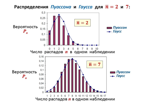If we express these two patterns on graphs, we can get almost identical patterns with an increase in the average number of decays. For example, if the average number of decays is 2, then there is some difference in the results of the Poisson and Gauss distribution, but when this number, for example, reaches 7 and higher values, this difference becomes less significant, as shown in (Figure 2.10).