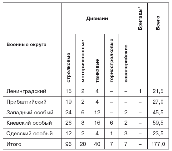 Вооруженные силы Советского Союза в условиях начавшейся Второй мировой войны продолжали расти. К лету 1941 г. они насчитывали 5373 тыс. человек. В сухопутных войсках имелось 303 дивизии, 16 воздушно-десантных и 3 стрелковые бригады. Войска имели 104 114 орудий и минометов, 23 140 танков и 18 570 исправных самолетов. Из этих сил в пяти приграничных западных округах имелось 177 расчетных дивизий (с учетом воздушно-десантных бригад). В западных военных округах СССР находились: