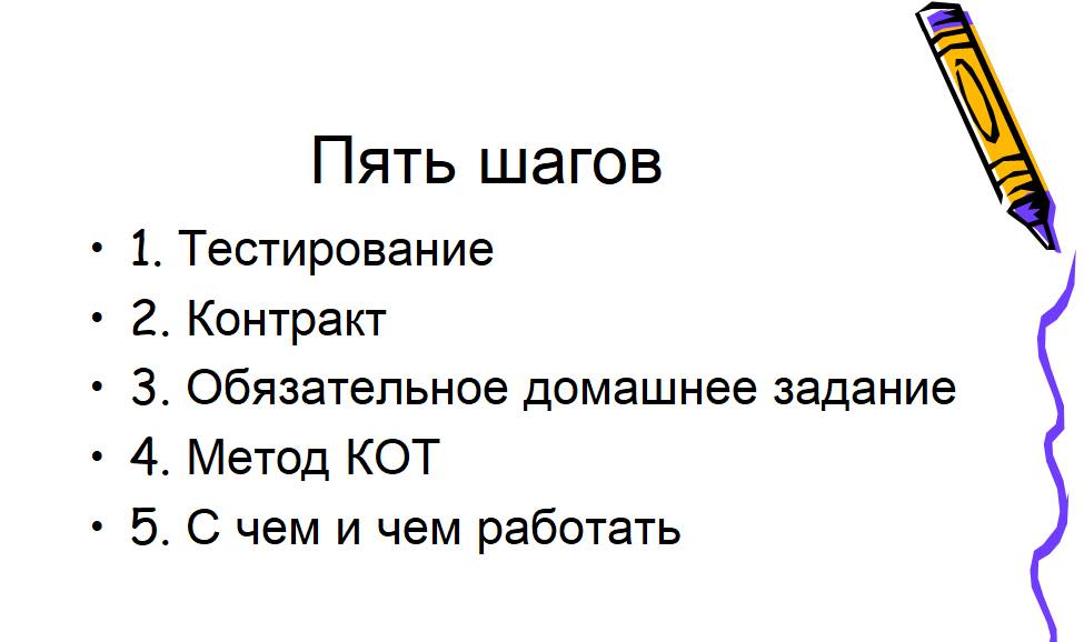 И так, я попробую уместить алгоритм того, как я работаю в 5 шагов. Шаг 5, будет чуть более размытый. Потому что, с чем работать и как работать в одном шаге, я попробую это дать в одном шаге, ну это чуть более широкий шаг, чем остальные. И так, мы начинаем с тестирования. Тестирование, контракт, обязательное домашнее задание. Я люблю давать домашнее задание, должна работа идти не только со мной в кабинете, а и между встречами, она тоже очень значимая. Метод КОТ(когнитивно-образная терапия), здесь я даю его как один из элементов возможной работы. Мне кажется, что в работе с депрессией, он будет очень хорошо менять состояние, и поэтому его как основу я обязательно беру. Но, мы поговорим о том, что только одного метода КОТ, здесь будет недостаточно. Даже так, я сразу кажу, по поводу метода КОТ, что он знаете, мы когда-то говорили с Ольгой (руководителем школы метода КОТ) об этом, о самой метафоре метода КОТ. Это получается как здоровое питание, когда у человека есть проблемы ЖКТ, если мы пропишем ему таблетки, такие как НЛП, ДПДГ, гипноз, но не поменяем ему питание, диету. То это будет временная помощь, которая возможно не будет такой устойчивой, как нам бы хотелось. Метод КОТ он больше работает, как такое правильное питание, диета. То есть, можно ли одной диетой изменить состояния организма? Можно. И это вам скажет любой специалист, в той же натуропатии. Можем ли мы изменить питанием свой организм? Можем. Но есть ситуации, в которых уже недостаточно просто поменять питание, и нужна экстренная помощь, внедрение таблеток. Вот иногда язва желудка, у человека, ему нужно пропить курс таблеток. Тоже самое и здесь, метод КОТ, это как здоровое питание, которое должно остаться у человека даже после нашего лечения. Чтобы он умел этим способом себя все время поддерживать в нормальном состоянии. Сложные этапы, он будет проходить со специалистом, даже в этом методе. Потому что, его желательно подкреплять другими элементами. Но в идеале, метод КОТ должен остаться, как постоянная диета, которая будет поддерживать его состояния здоровья всегда. И 5-й шаг, с чем и каким образом мы работаем, тоже об этом поговорим.