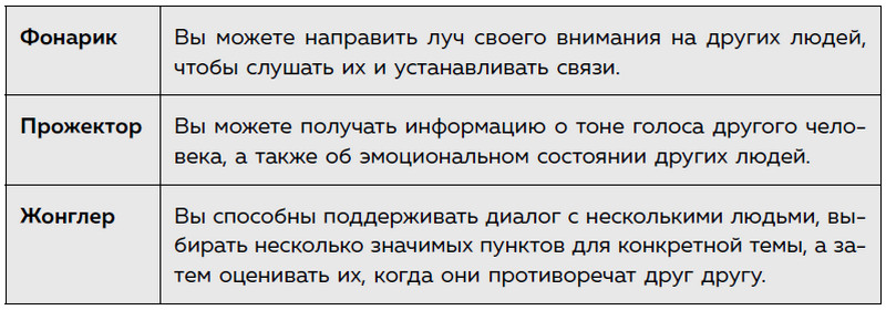 Когда мы просим кого-либо «обратить внимание», чаще всего мы имеем в виду первое – сфокусироваться на чем-либо. Но в понятие внимания входит еще многое другое. Внимание – это своего рода валюта, ресурс, который можно использовать по-разному. Мы используем его практически во всех аспектах нашей жизни, и каждая форма, которую оно способно принимать (фонарик, прожектор, жонглер), играет свою роль в том, что мы делаем. Мы уже говорили о том, что внимание позволяет вам воспринимать окружение. Помимо восприятия, эти три формы внимания работают в трех областях обработки информации: когнитивной, социальной и эмоциональной. Посмотрите на три простые таблички снизу, чтобы представить себе, как внимание работает в каждой из этих сфер. В общем, можно сказать, что они охватывают всю «обработку информации», которую вы проводите в течение дня и в целом в течение вашей жизни.