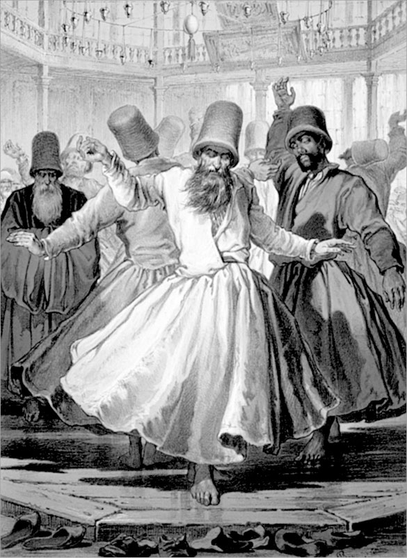К одной из самых интересных сект дервишей относится орден мевлеви, более известный как танцующие, или крутящиеся, дервиши. Согласно общепринятому мнению, этот орден был основан великим персидским суфием, поэтом и философом Джалал ад-дином Руми (1207–1273 гг.). Наблюдателей поражает удивительная способность вертящегося дервиша кружиться с невероятной скоростью, а затем неожиданно останавливаться, наклоняться и поднимать булавку. Дервиш способен невероятно долго продолжать свой танец, не испытывая при этом никакого головокружения.
