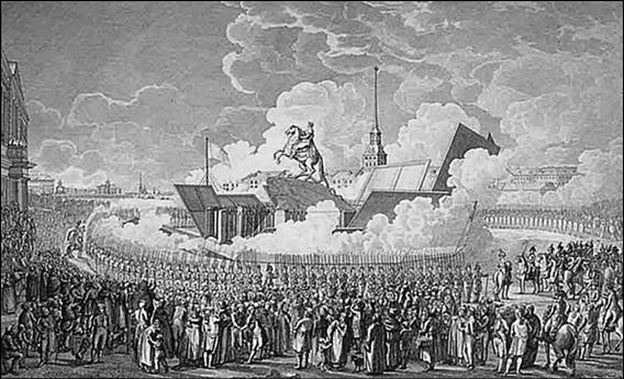 Открытие памятника Петру I в Санкт-Петербурге 7 августа 1782 г. Гравюра А.К. Мельникова. 1786 г.