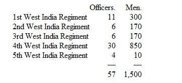 The officers of the 1st West India Regiment who took part in this expedition were Lieutenant-Colonel A.W. Murray, Captains H. Anton, J.A. Fraser, J. Fanning, and G.H. Duyer, Lieutenants A. Temple, J. Moffitt, R. Brew, T. Edmunds, J. Bourke, and Ensigns M.C. Garsia and T. Nicholson. Lieutenant-Colonel Murray was awarded the C.B. for his services.