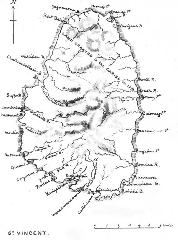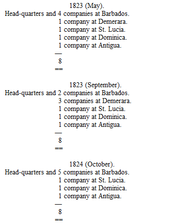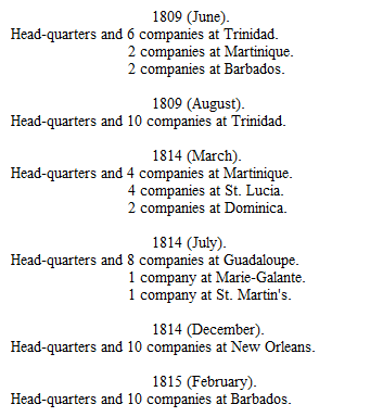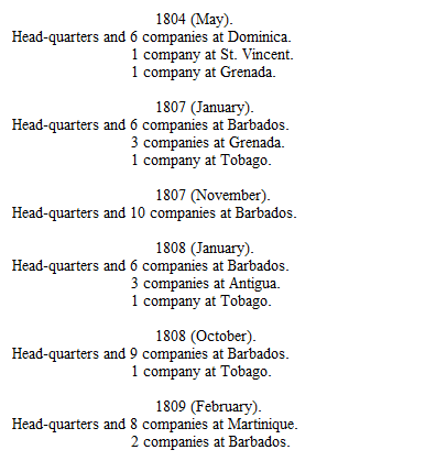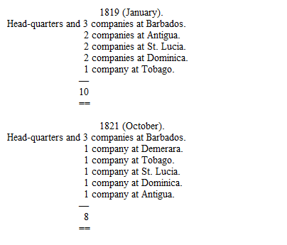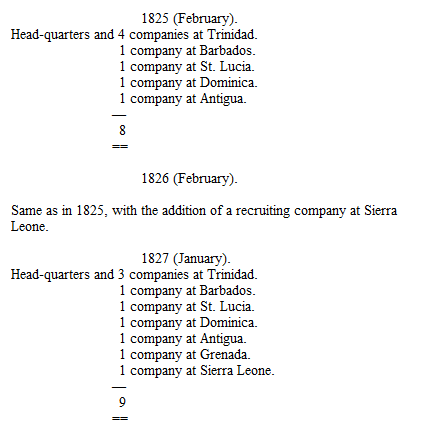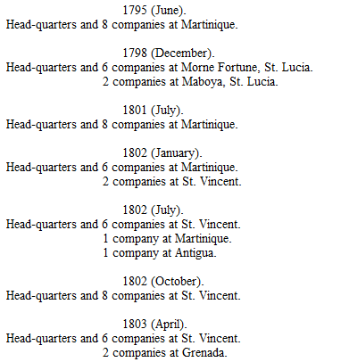 "The military force in St. Vincent consists at present of a regiment of infantry and a company of artillery, sent from England; and a black corps raised in the country, but provided for, with the former, on the British Establishment, and receiving no additional pay from the island." – Bryan Edwards, vol. i. p. 428.