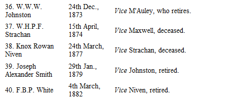 During its three years' tour of West African service the regiment had suffered very heavy loss amongst the officers. In addition to the eight deaths that occurred in 1874, directly after the Ashanti war, Captain W. Cole died in Ireland of fever contracted on the Gold Coast; Lieutenant-Colonel Strachan and Sub-Lieutenant Turner in England; and Sub-Lieutenants S.B. Orr and G.V. Harrison at Sierra Leone in 1876.