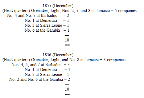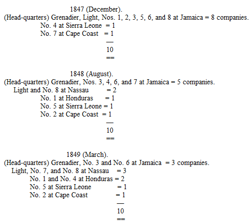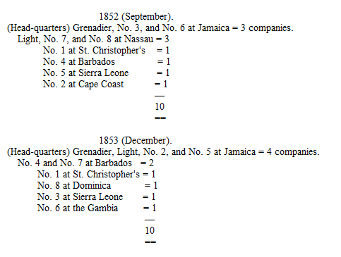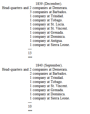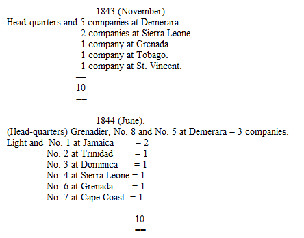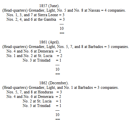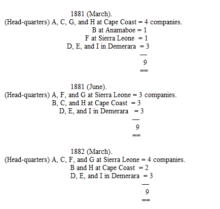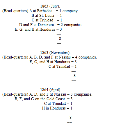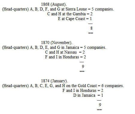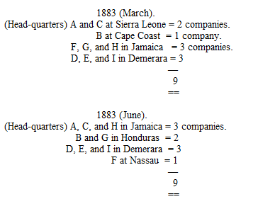 The distribution of the 1st West India Regiment is now (May, 1883): Head-quarters and three companies (A, C, and H) at Jamaica, two (B and G) in Honduras, one (F) in Nassau, and three (D, E, and I) in Demerara.