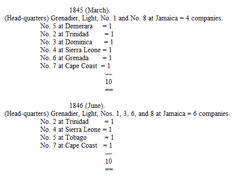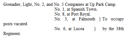 The companies in Jamaica were detached thus: No. 1, No. 8, and Grenadier Company at Up Park Camp. The Light Company between Port Antonio and Montego Bay.
