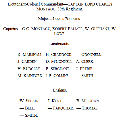 At the cessation of hostilities, the South Carolina Regiment and the Loyal American Rangers were removed to Jamaica, and as they are shown in the Jamaica Almanack for 1782 as being then in the island, they presumably arrived there about December, 1781. The South Carolina Regiment was probably dismounted, as it is shown as being stationed at Fort Augusta in Kingston harbour. At this time, the reinforcing of the West India Islands by provincial corps was considered most important, and in a letter to Sir Guy Carleton we find the following: "The object of reinforcing those islands is so important, that His Majesty wishes to have it understood that every provincial corps embarking for the West Indies shall immediately be put upon the British Establishment." It was, probably, on some such understanding that the two corps above mentioned proceeded from South Carolina; but the promise, if made, was never fulfilled, and neither of the two ever appeared in any Army List. The following is the list of officers of the South Carolina Regiment given in the Jamaica Almanack:
