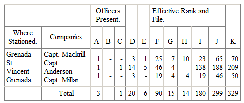 In February, 1789, all three companies of the "Black Corps of Dragoons, Pioneers, and Artificers" were stationed in Grenada, and from that date until June, 1793, they are shown in every monthly return, with a strength varying from 279 to 268, and an increase of four first lieutenants.