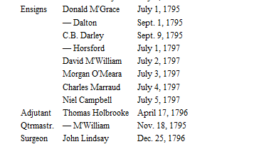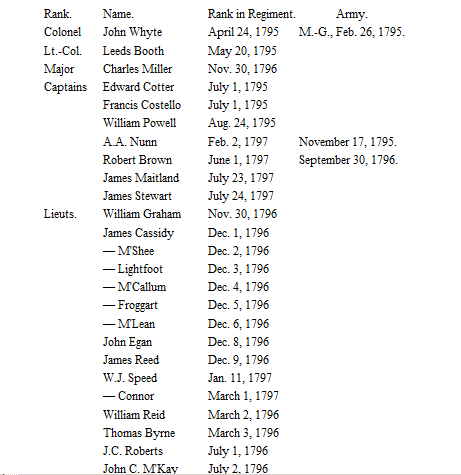 The following is the list of the officers who were serving in the 1st West India Regiment in 1797, and it may be observed that so many changes had taken place that, out of 43 officers who were gazetted to the regiment in 1795, only 22 were left in 1797: