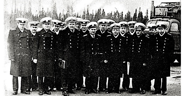 1974 год. Групповое фото офицеров и мичманов радиостанции «Атлант». В центре главный инженер капитан 2 ранга Копытин Н. Г.